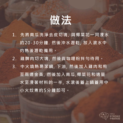 南瓜雖然屬於鉀質較高的蔬菜, 先去皮切粒浸水, 再用水灼能大大減少鉀質量. 煮咖哩時可將南瓜壓爛, 帶出甜味做成咖哩醬。